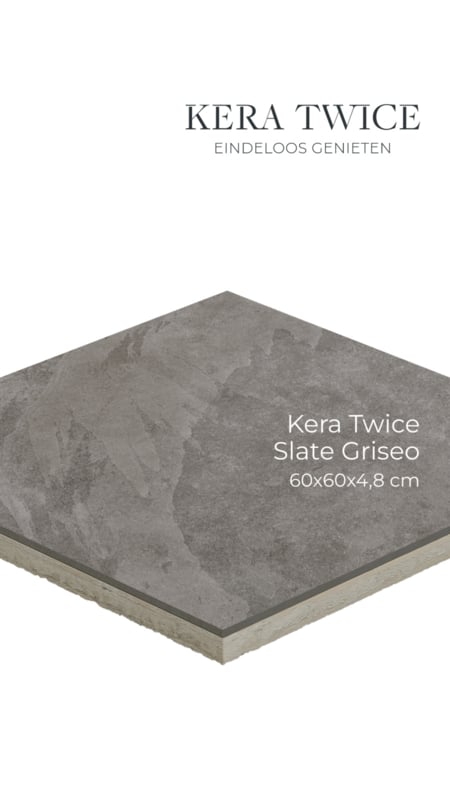 Leg de tuin aan met de Kera Twice 60×60 Slate Griseo van Excluton. Perfect voor de aanleg van een prachtig terras, looppad en andere licht belastbare bestrating. Dankzij het 60×60 cm formaat is deze tegel geschikt voor zowel kleine als grote oppervlaktes. Zo kan je elke tuin voorzien van een prachtig terras. Dankzij de keramische toplaag is de Kera Twice 60×60 tuintegel gemakkelijk schoon te maken. Zo kan je het hele jaar door optimaal genieten, zonder te veel tijd kwijt te zijn aan onderhoud.