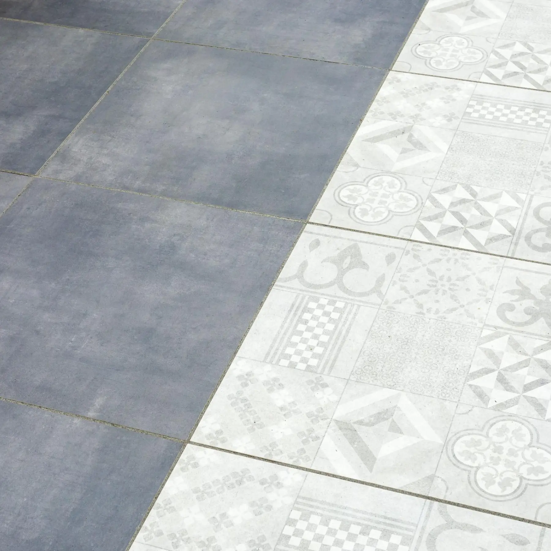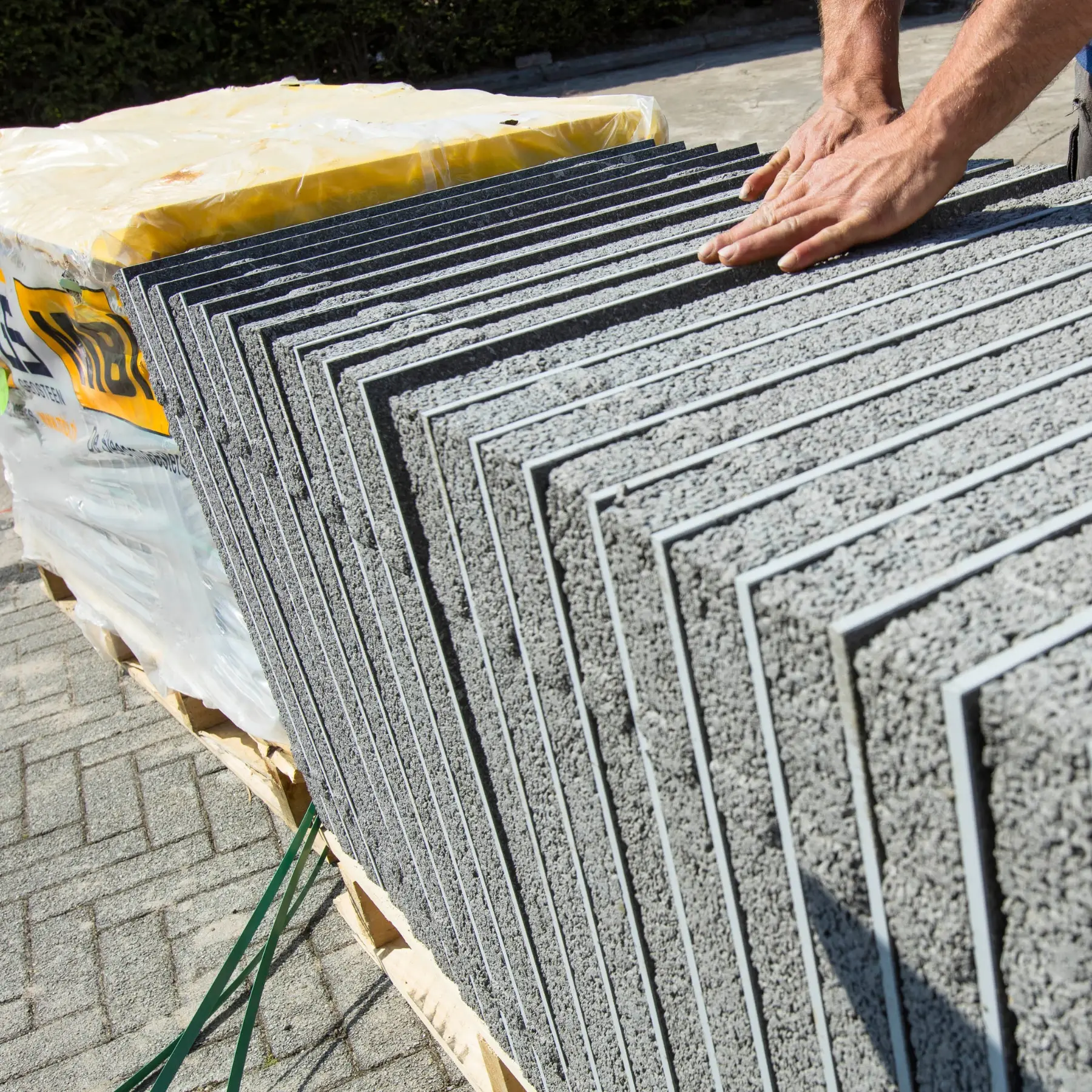 Vele (keramische) tegels, bestrating en opsluitbanden buiten te bezichtigen.