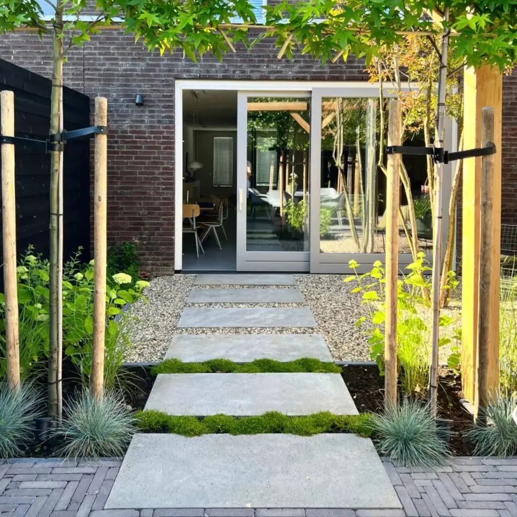 Grootformaat tegels zijn bij een twee-onder-een-kapwoning erg populair. Niet alleen omdat ze rustig ogen, maar ook omdat ze je tuin optisch groter laten lijken. Denk aan een terras met Schellevis 60×60 cm of een strakke oprit van Tremico BKK klinkers in een mooi legverband.
